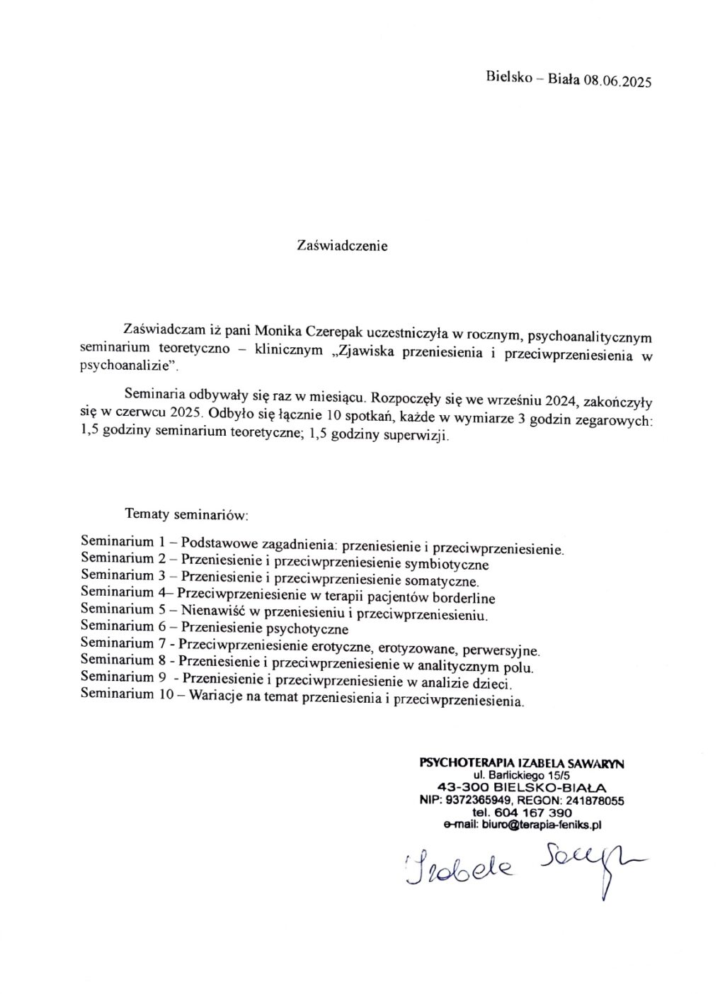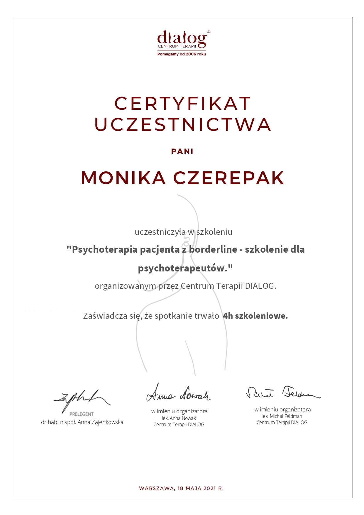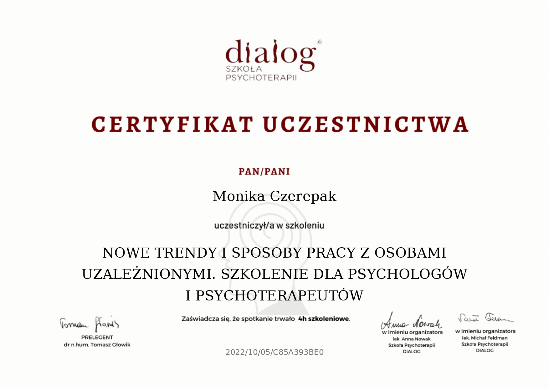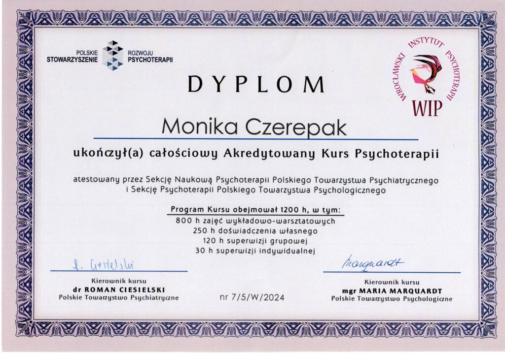 Jestem psychoterapeutą w trakcie certyfikacji we Wrocławskim Instytucie Psychoterapii, akredytowanego przez Polskie Towarzystwo Psychologiczne i Psychiatryczne.