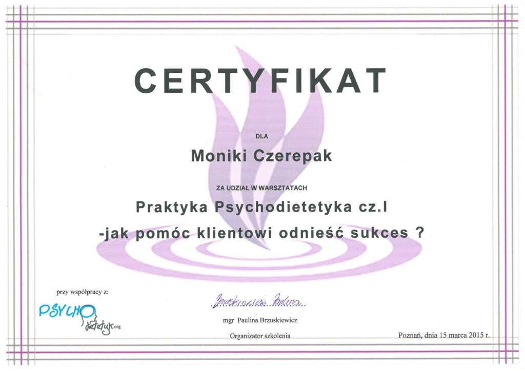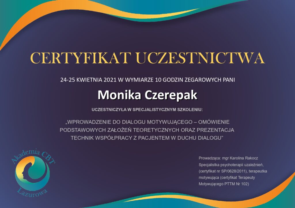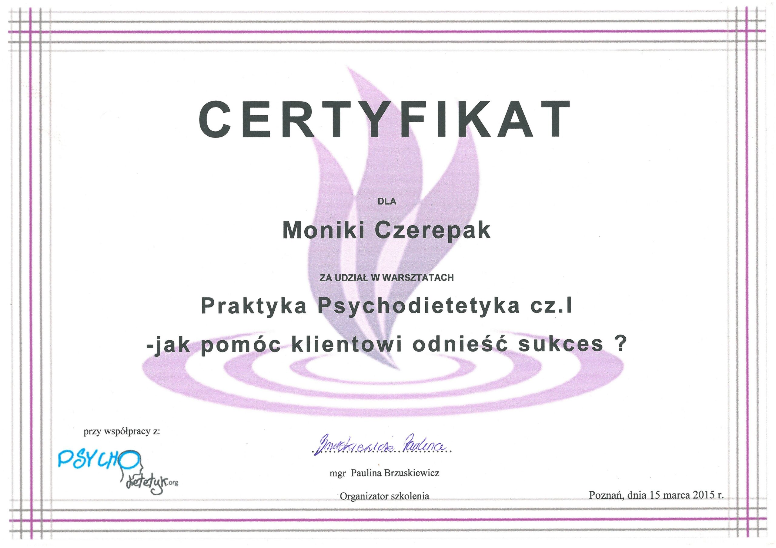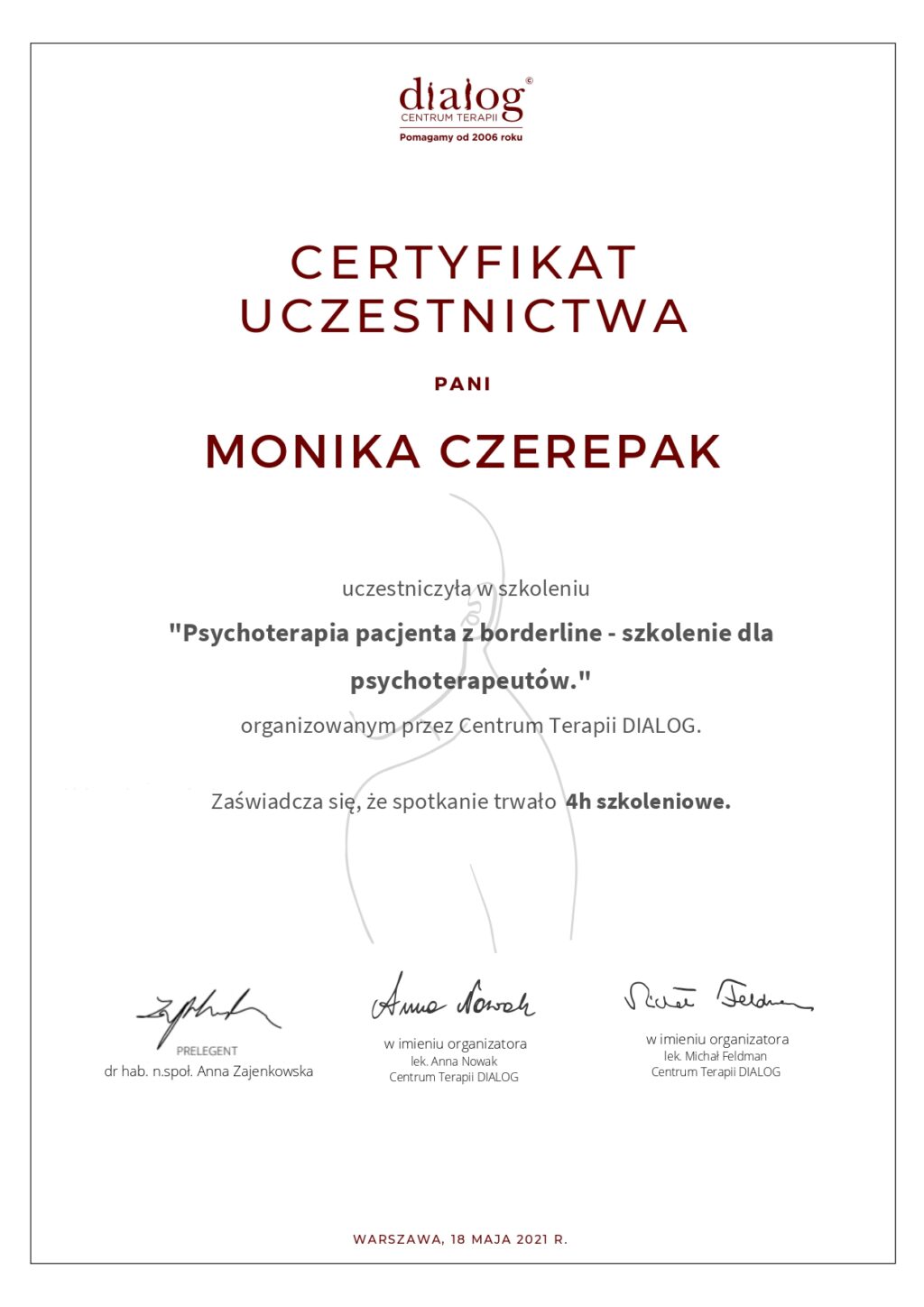Jestem psychoterapeutą w trakcie certyfikacji we Wrocławskim Instytucie Psychoterapii, akredytowanego przez Polskie Towarzystwo Psychologiczne i Psychiatryczne.
